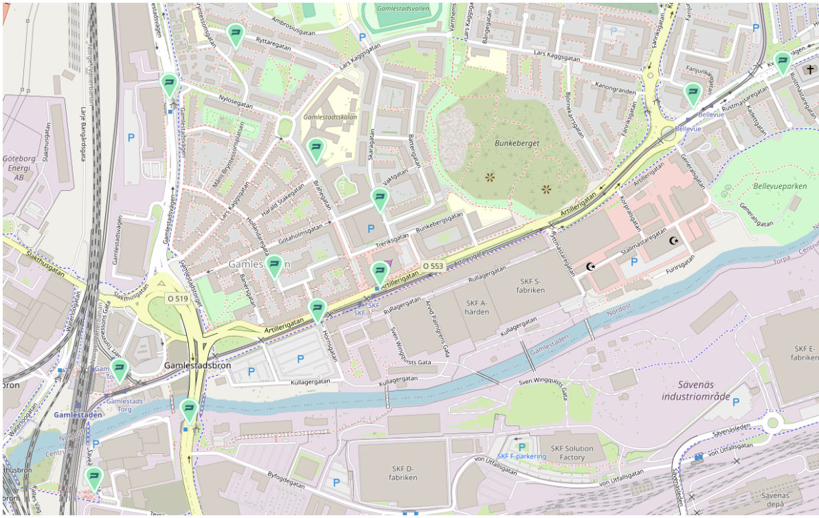 Nu finns en ny kartlösning där du får en samlad översikt över mobilitetstjänsterna i Gamlestaden. De gröna symbolerna utmärker en mobilitetshubb med poolbilar, pool- eller lånecyklar, kollektivtrafikhållplats, etc. Klick ger dig direkt information om vad som finns på platsen och möjlighet att gå vidare med att hyra.