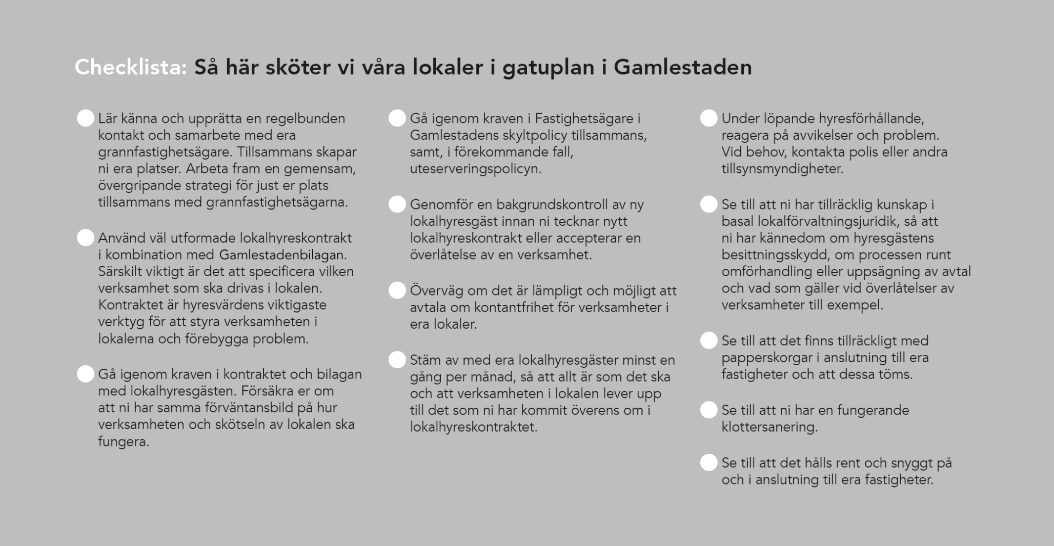 Fastighetsägare i Gamlestaden har tagit fram två avgörande verktyg vid lokaluthyrning: Gamlestadenbilagan och Checklistan. De hjälper dig att hyra ut till rätt hyresgäst på rätt villkor.